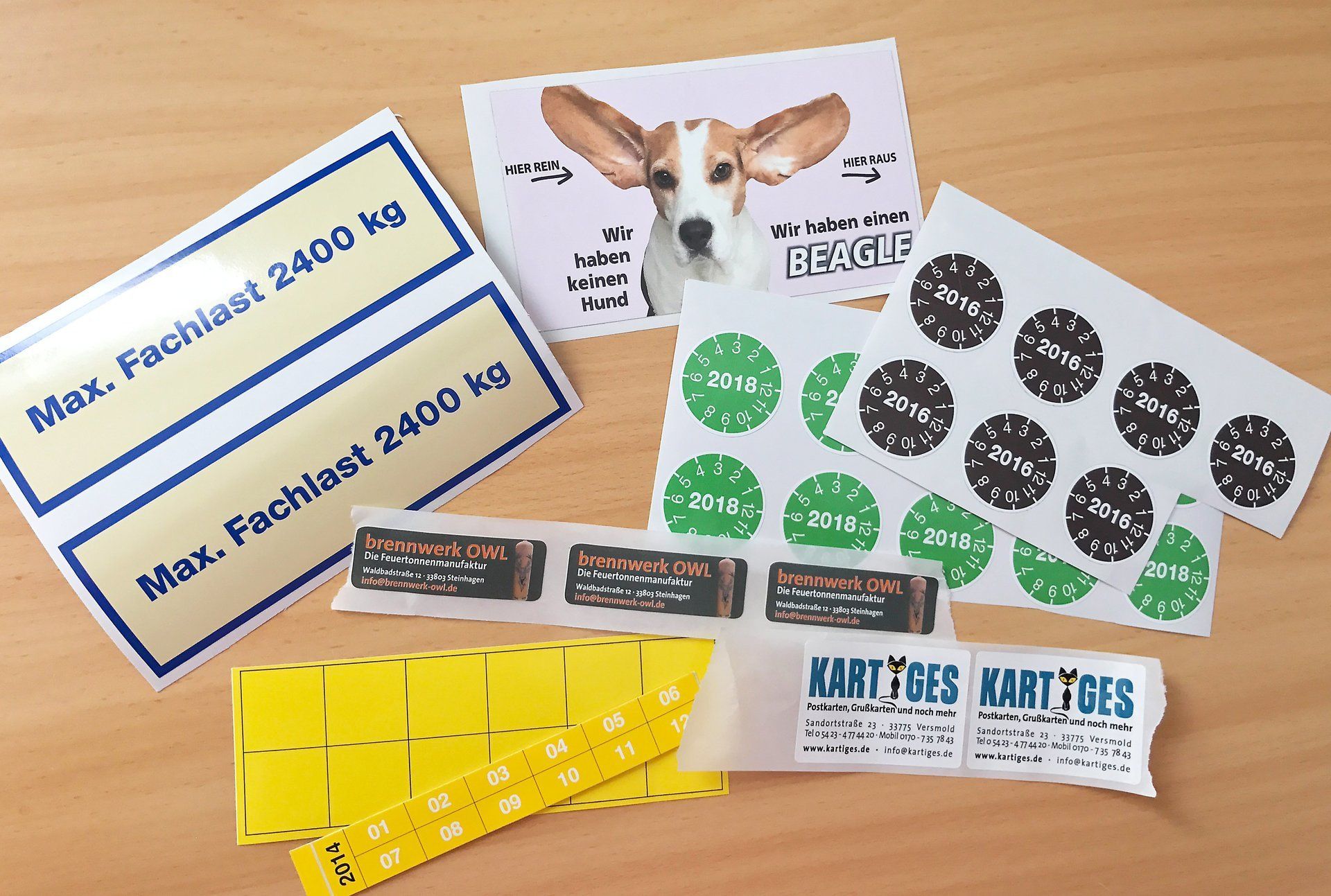 Aufkleber, Etiketten, Briefbögen, Visitenkarten, Flyer, Broschüren, Einladungskarten, Schilder,
